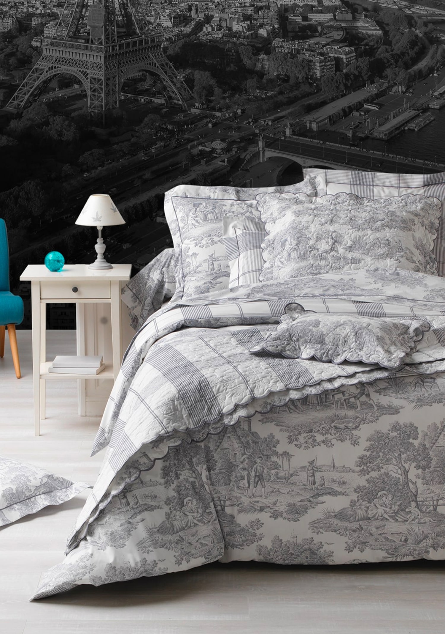 Inspirée de la toile de Jouy traditionnelle, notre parure PASTORALE fait dialoguer patrimoine et modernité. Elle revient aujourd’hui au cœur des tendances déco grâce à son élégance intemporelle et ses deux coloris : Bleu et Argent.