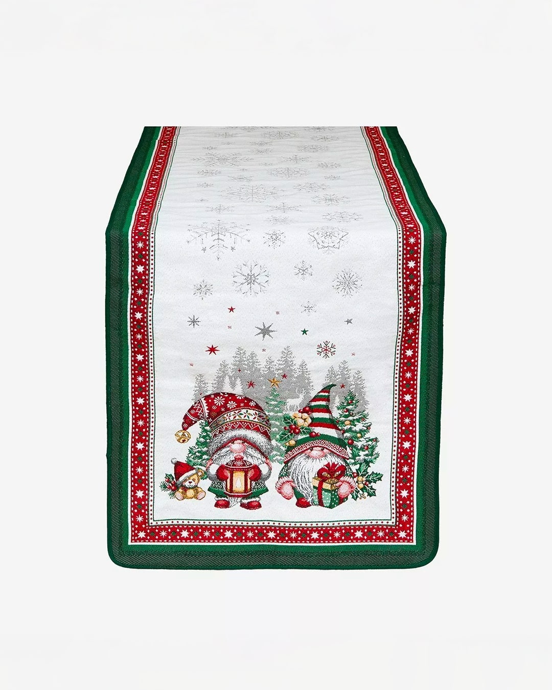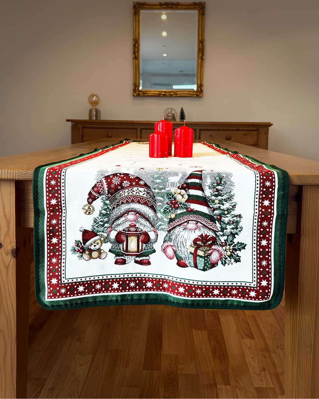 Plongez dans l’univers enchanté de Noël avec ce magnifique chemin de table en Jacquard, illustré de deux adorables nains entourés de sapins et de cadeaux. Son design détaillé et son charme traditionnel en font une pièce maîtresse idéale pour habiller votre table pendant les fêtes.
