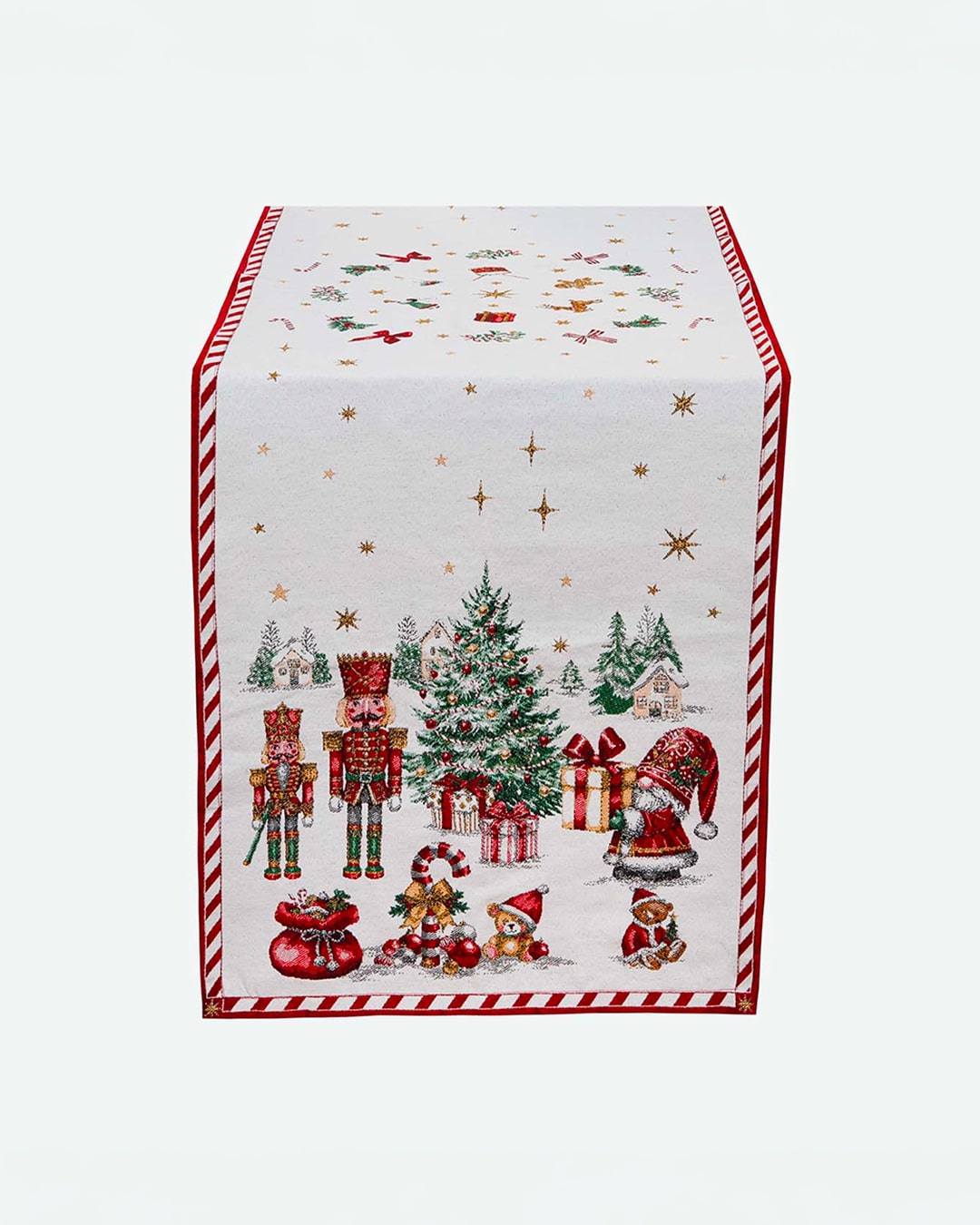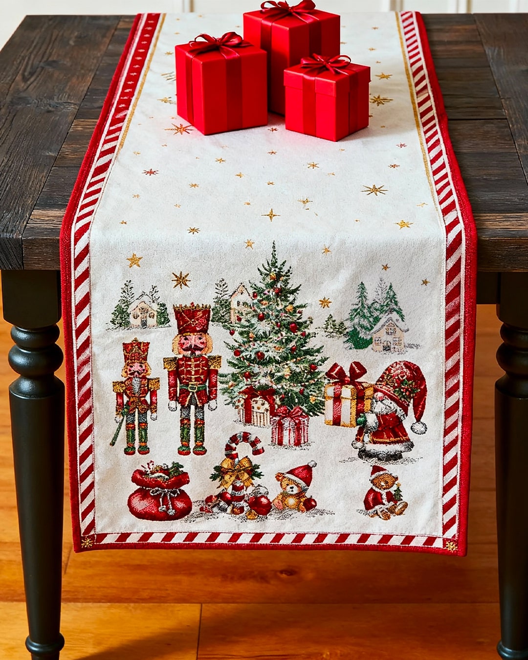 Plongez dans la magie des fêtes avec ce magnifique chemin de table CHRISTMAS, tissé en Jacquard et décoré de scènes emblématiques de la saison : casse-noisettes élégants, sapin généreusement garni, maisonnettes enneigées, cannes de sucre d’orge et cadeaux colorés. Une décoration festive qui apporte instantanément un charme authentique à votre intérieur.