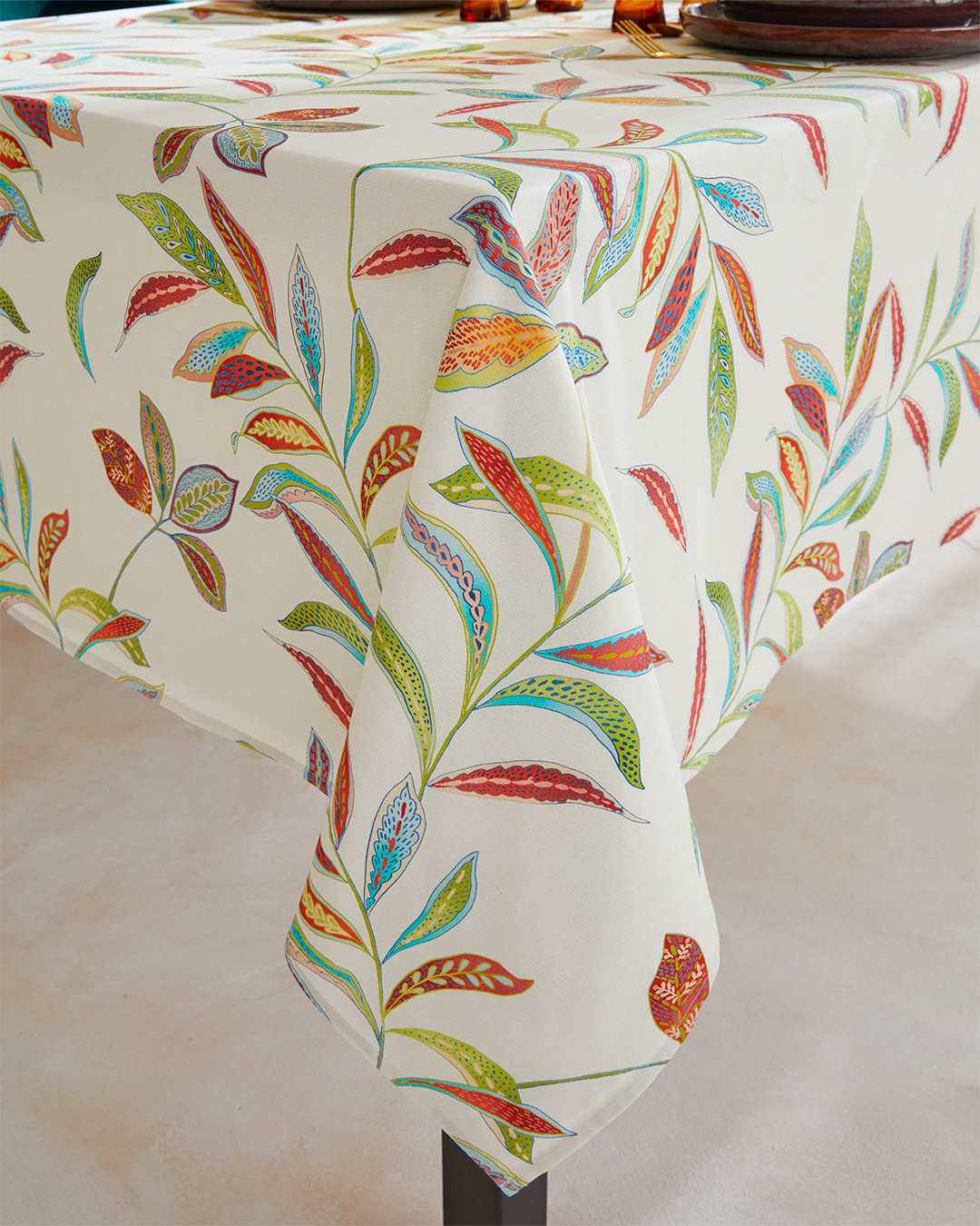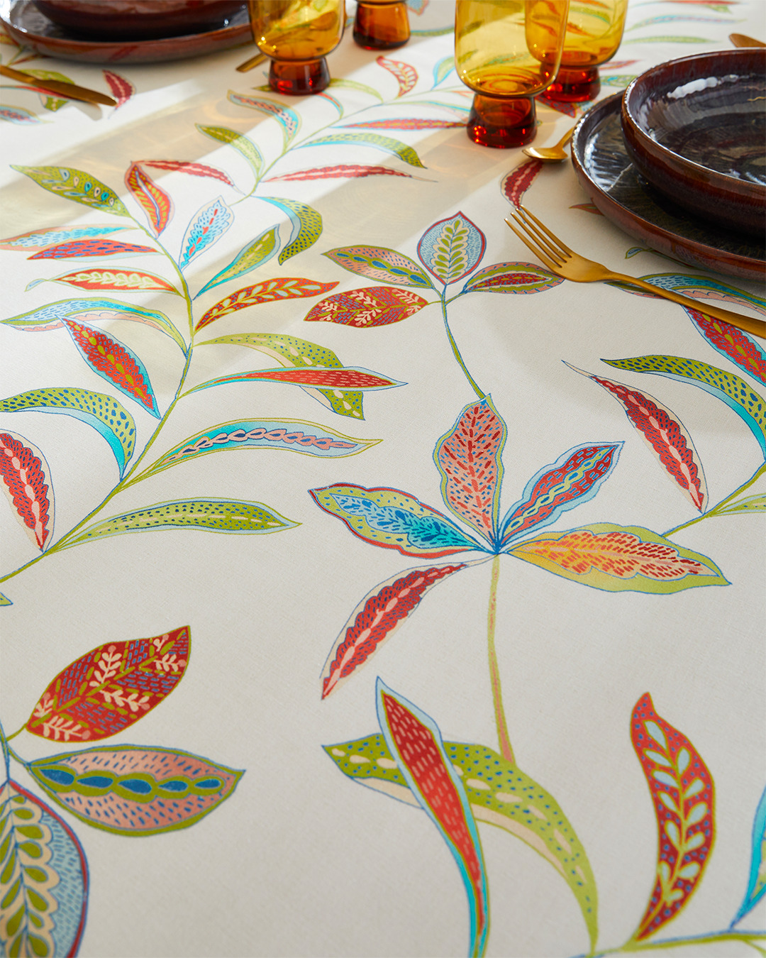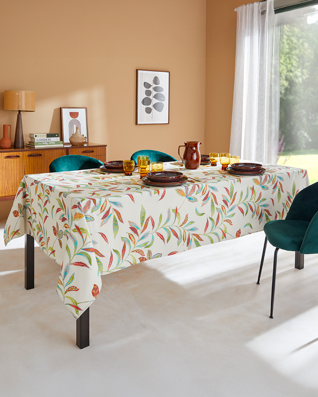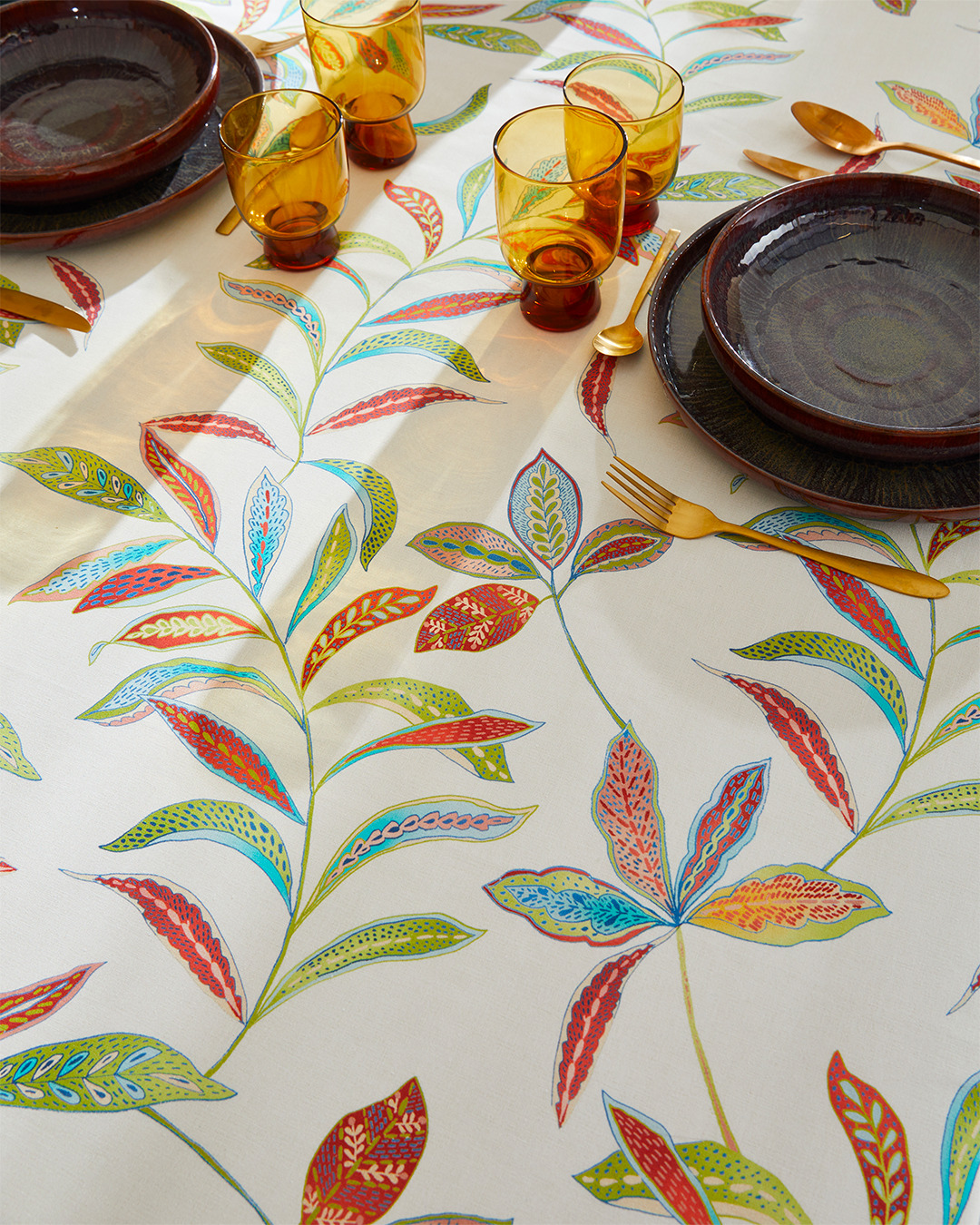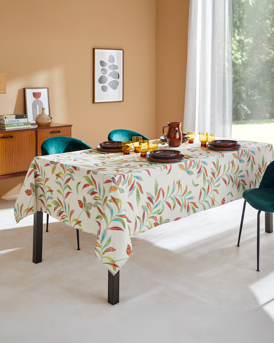 Son motif de feuilles stylisées, riche en détails et en couleurs, apporte chaleur et caractère à la table, tout en s’entretenant facilement grâce à son enduction acrylique : un simple coup d’éponge suffit pour la garder impeccable.