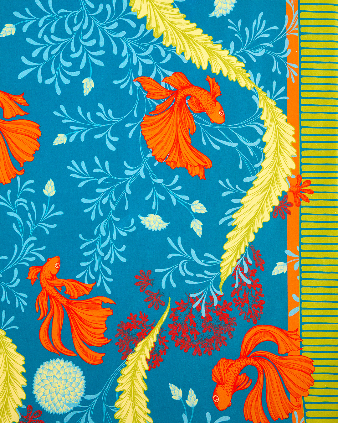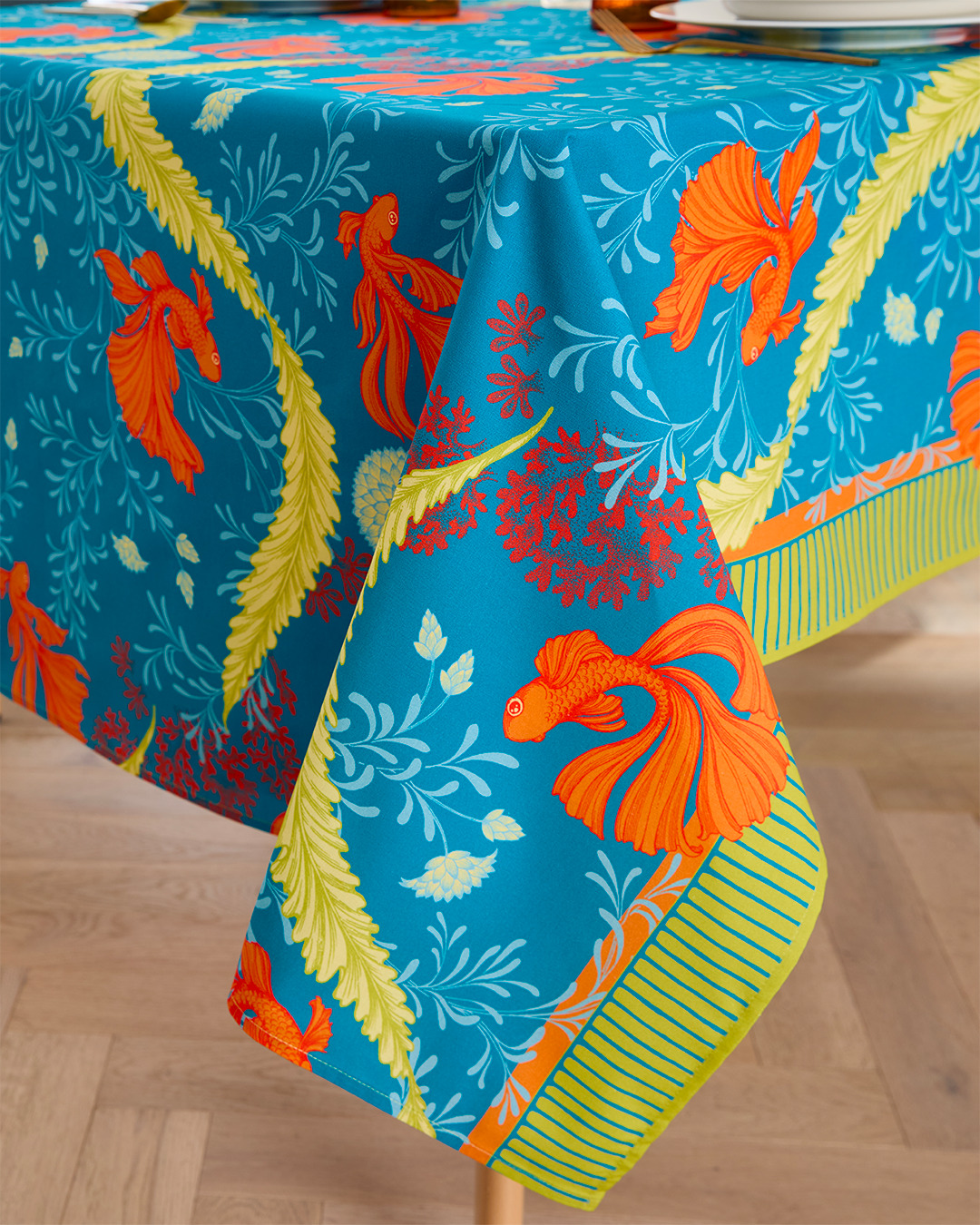 Ses motifs floraux et aquatiques, rehaussés de touches dorées et orangées, composent une danse raffinée sur un fond bleu profond. Inspirée des étoffes d’antan revisitées avec modernité, elle apporte une atmosphère à la fois chic et conviviale à votre table.