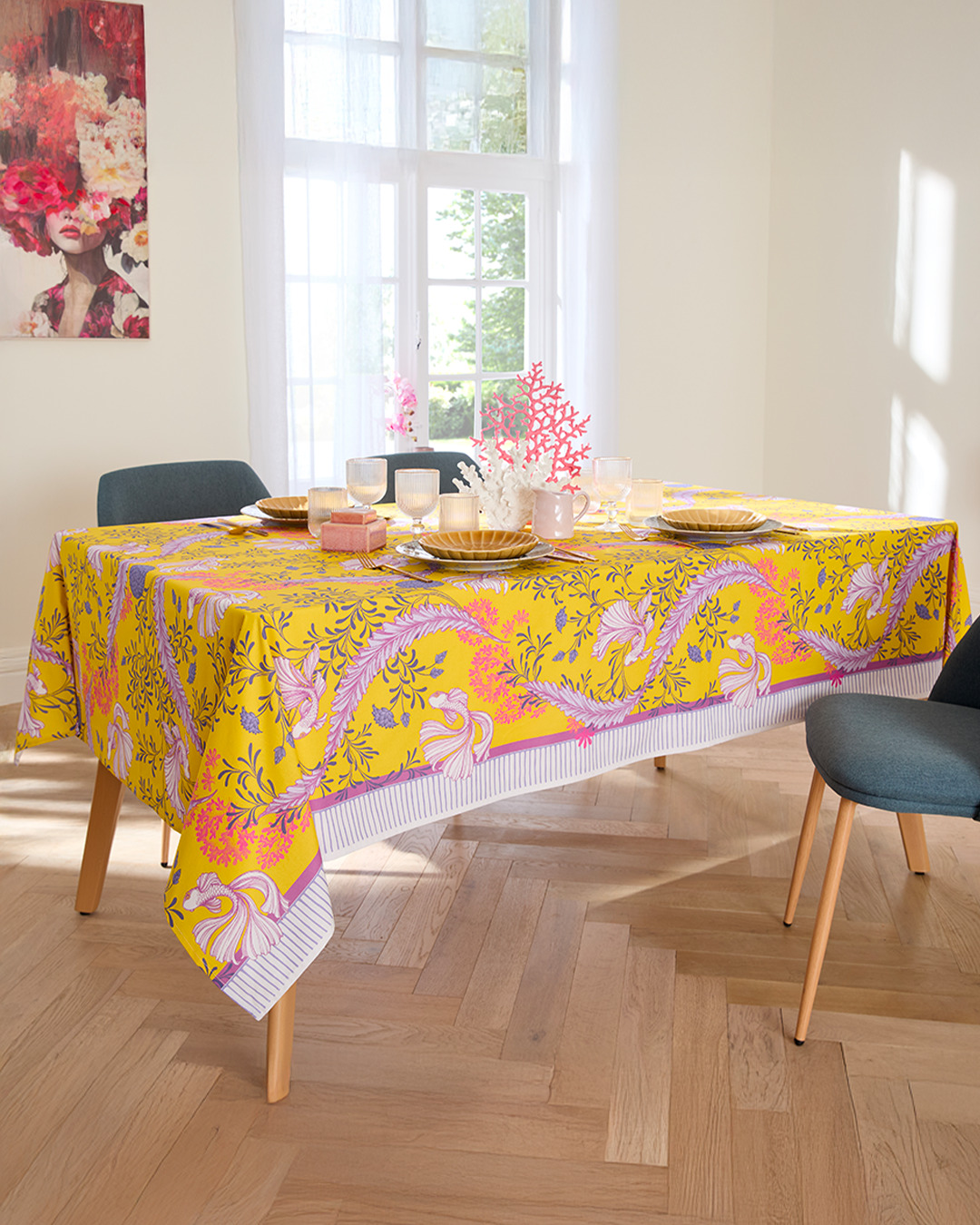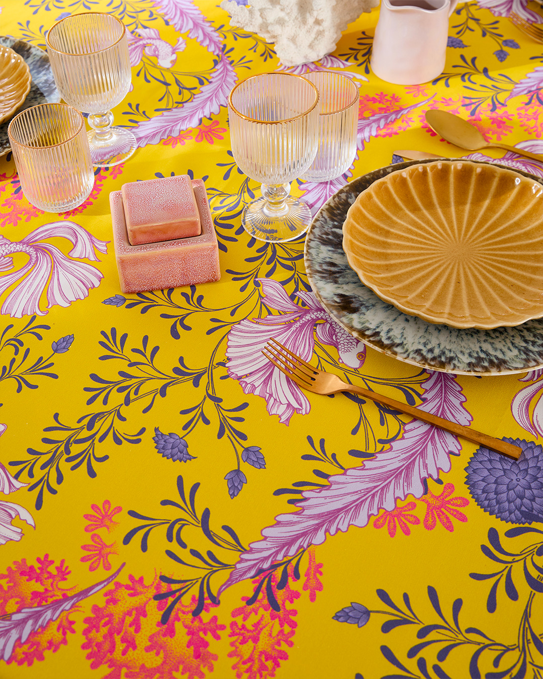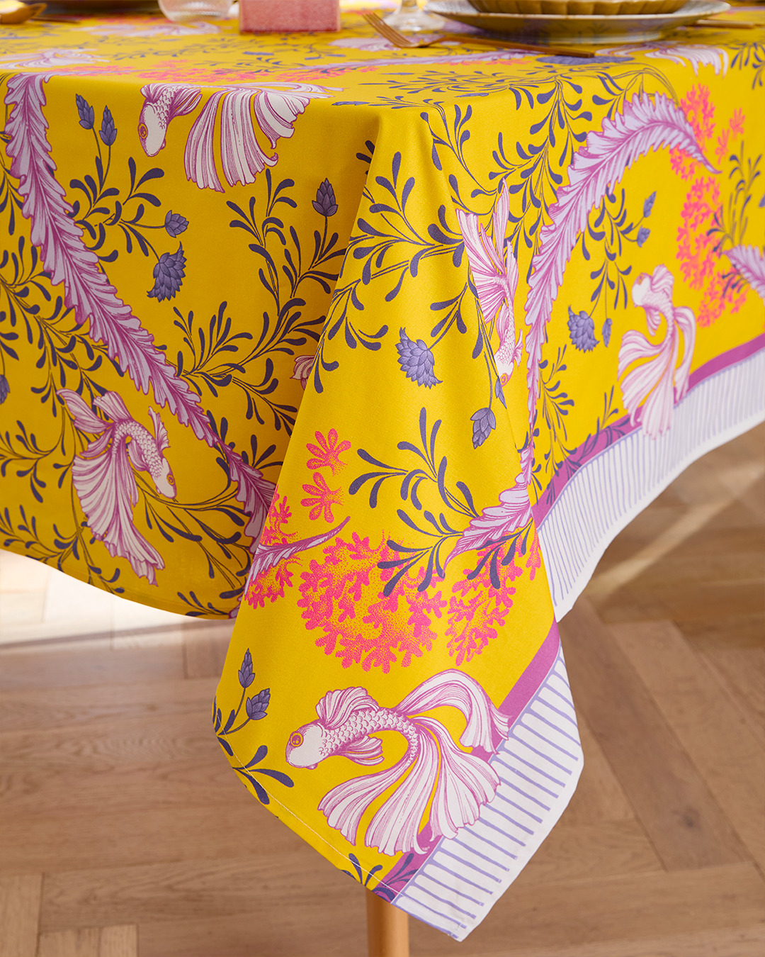 Son fond jaune lumineux, ponctué de feuillages lilas et de poissons délicatement dessinés, illumine instantanément la table.